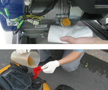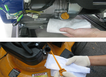 Warning: ensure that the sparking plug wire has been disconnected and keep it far away from sparking plug to prevent accidental starting. Clean around the oil filler opening and oil drain cock and prevent dirt and scrap to fall into crankcase (as shown on the right diagram).